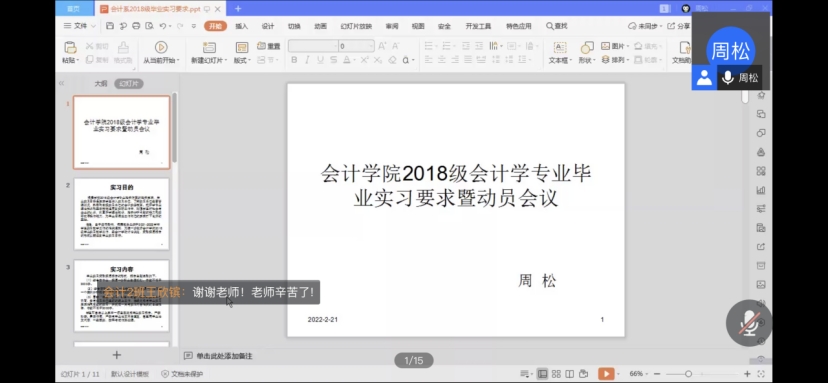 2022年2月21日,黄色小说 周松在腾讯会议上给2018级会计学专业学生开展了毕业实习动员会议。动员会议上,周松从实习内容、实习时长、时间节点、考核方式、指导老师、安全措施、安全预案等七个方面讲解了这次毕业实习的具体要求。会议要求全体同学一定按照学院相关规定完成本次毕业实习。