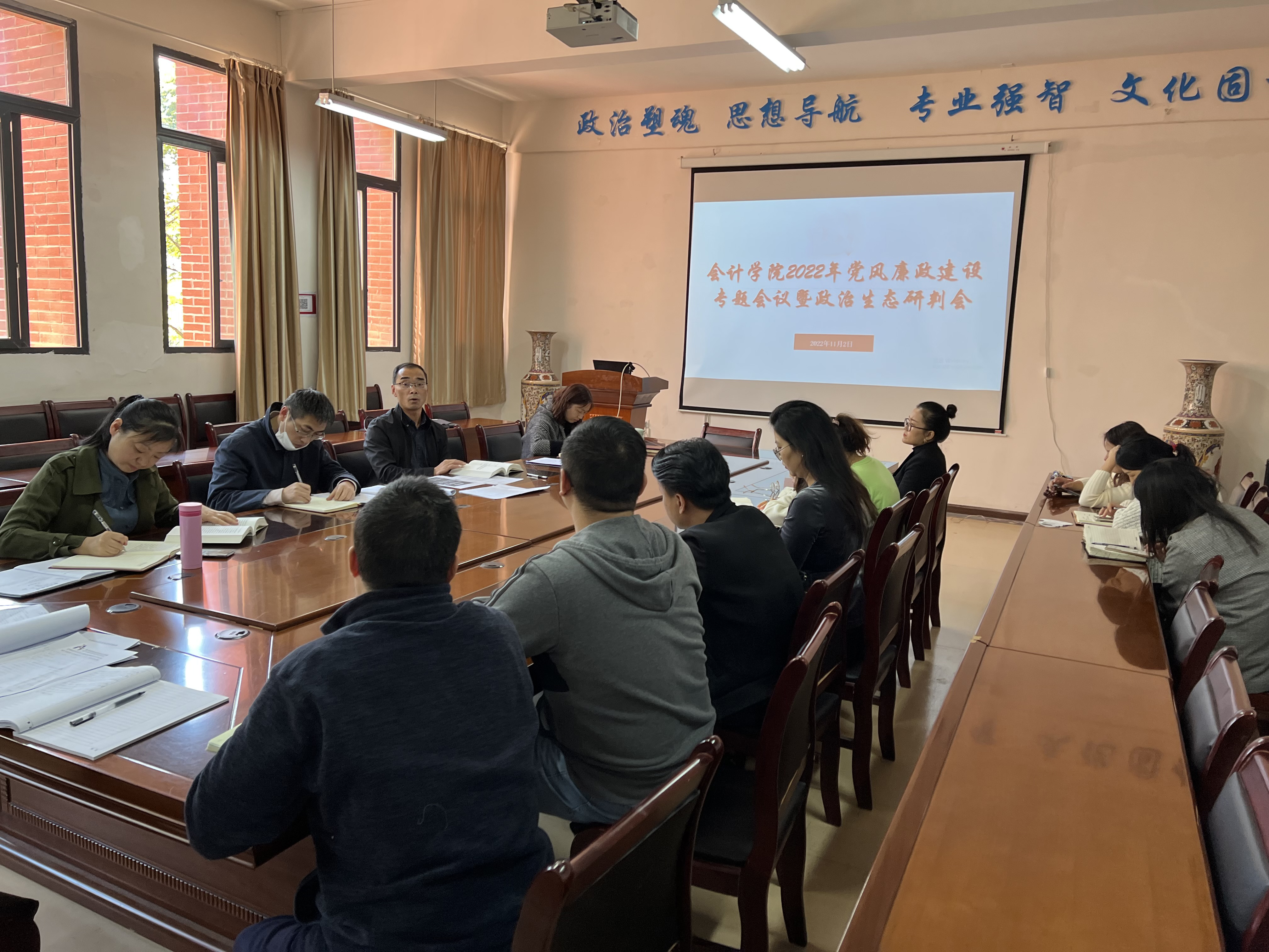 在崇德楼206会议室召开2022年党风廉政建设专题会议暨政治生态研判会,学院领导、副科级以上干部及各党支部书记参加会议。会议由党委书记聂永刚主持。