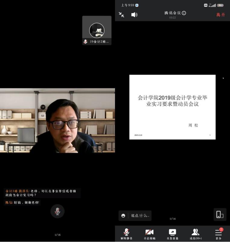 2023年2月25日,黄色小说 周松在腾讯会议上给2019级会计学专业学生开展了毕业实习动员会议。动员会议上,周松从实习内容、实习时长、时间节点、考核方式、指导老师、安全措施、安全预案等七个方面讲解了这次毕业实习的具体要求。会上,他要求全体同学一定按照学院相关规定完成本次毕业实习。