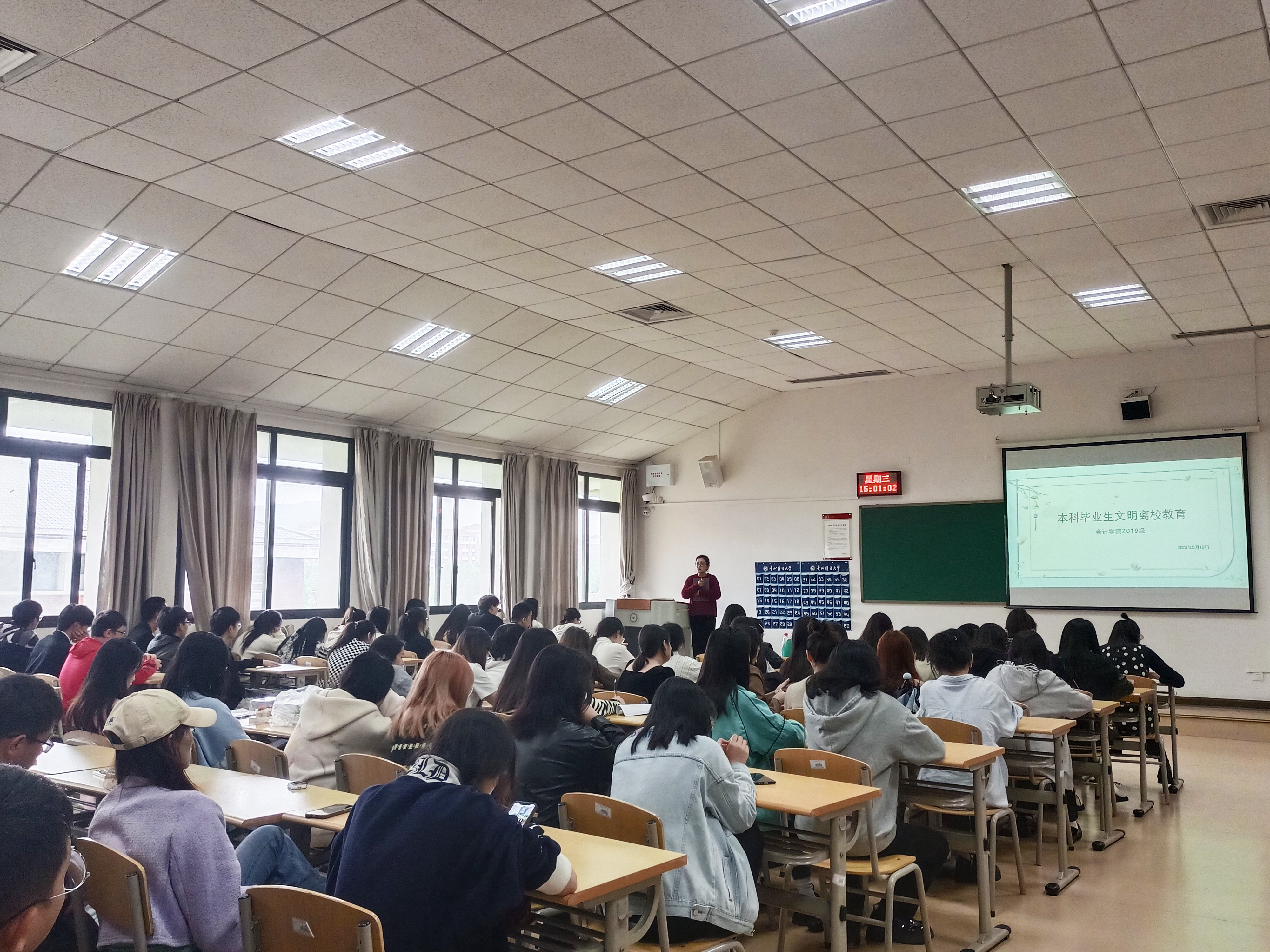 在崇德楼512教室举行2019级本科生文明离校教育,学院共计276名本科毕业生到场参加,辅导员蒲亚晴担任主讲人。