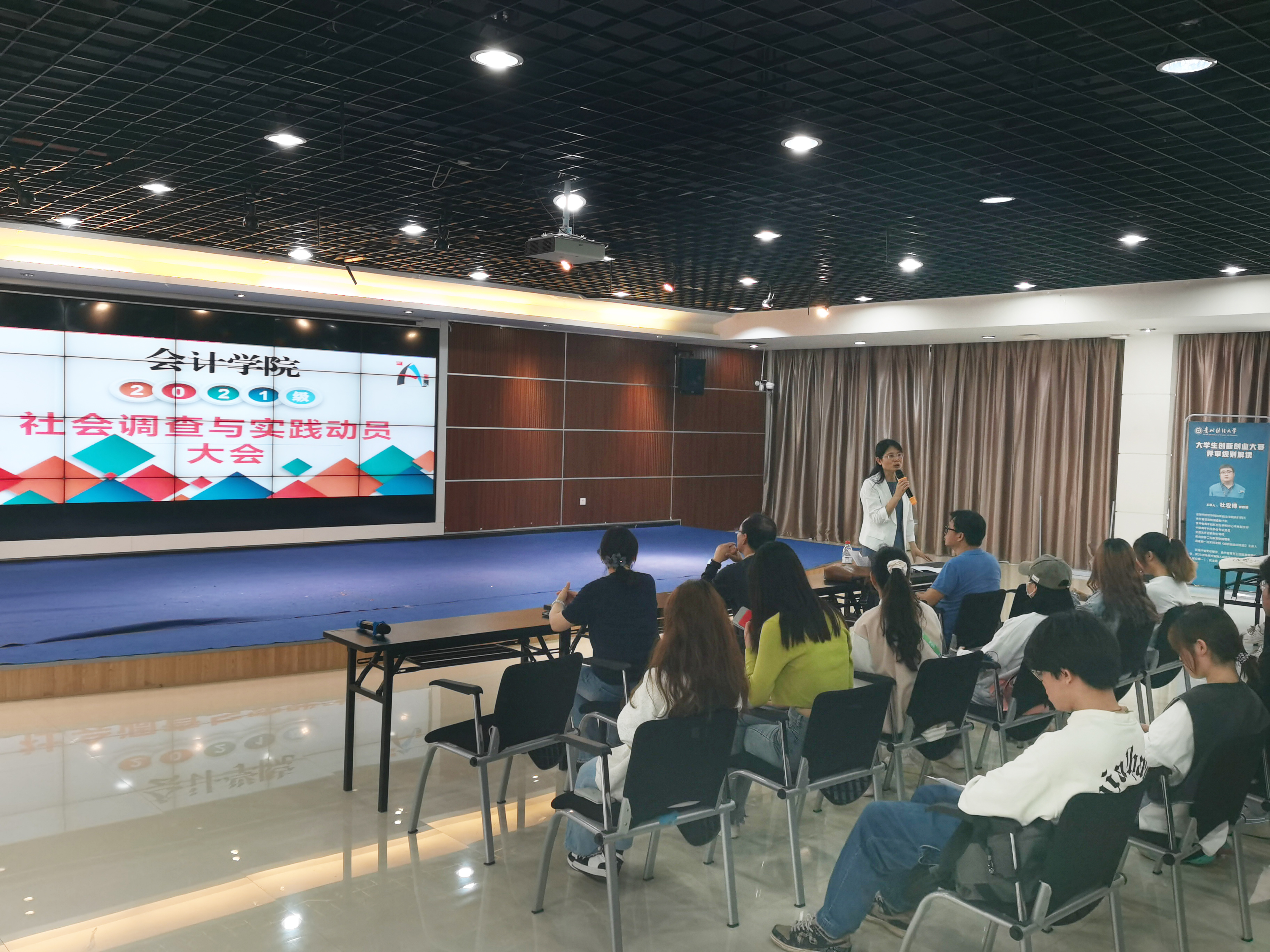 在笃行楼B栋102b创新创业展厅召开2021级本科生社会调查与实践动员大会。学院党委书记聂永刚、党委副书记黄忠莉、副院长钱润红、会计系主任周松、教务科相关老师及2021级全体学生参会。
