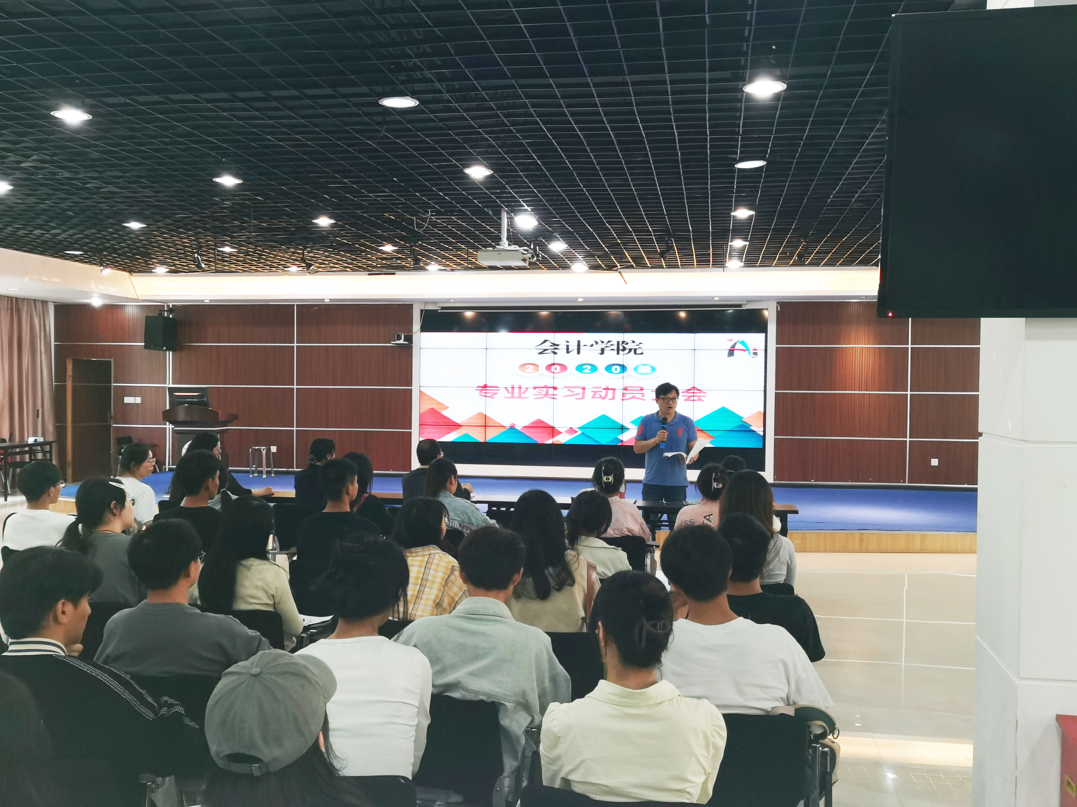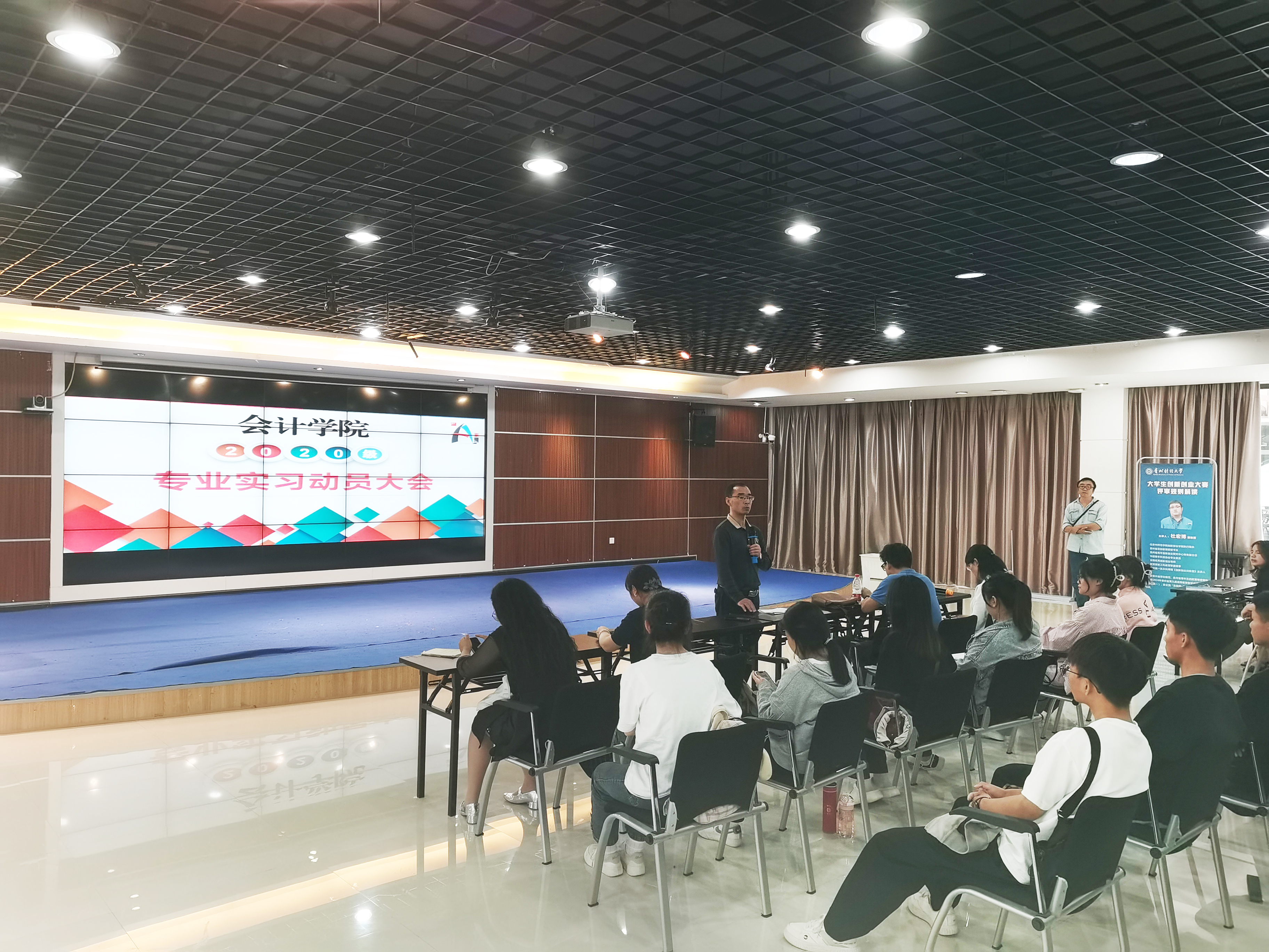 在笃行楼B栋102b创新创业展厅召开2020级本科生专业实习动员大会,学院党委书记聂永刚、党委副书记黄忠莉、副院长钱润红、会计系主任周松、教务科相关老师及2020级全体学生参会。