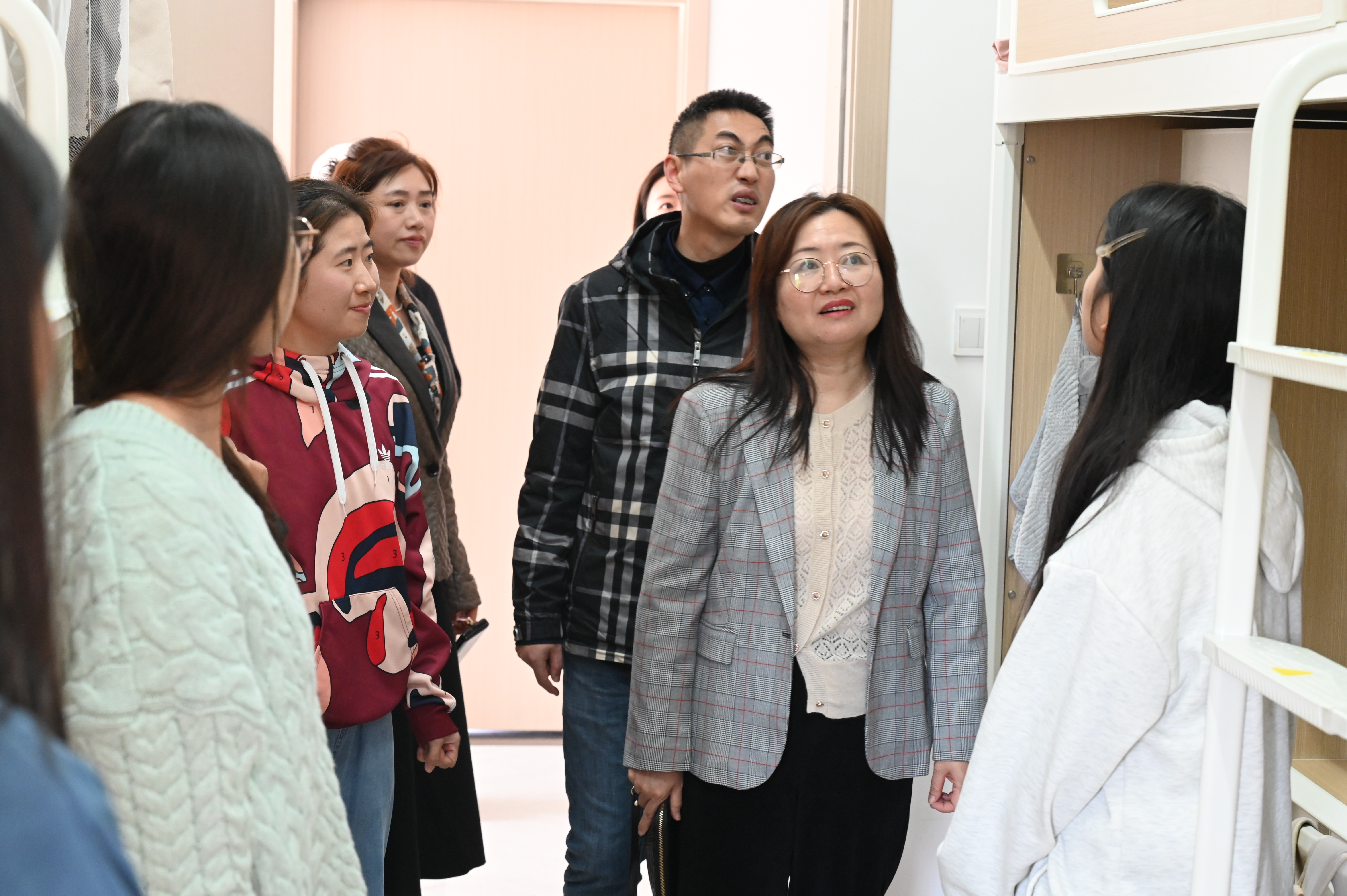 最后,肖小虹深入到东校区文心苑寝室进行走访,充分了解学生的思想动态和学习生活情况。“同学们来自哪里?”“上下楼梯滑不滑?”“热水水温够不够?”“对学校各方面有什么建议?”……肖小虹的关切慰问让同学们倍感温暖,深刻感受到了学校对学生们的关心和关怀。