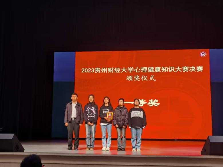 的李盈盈、覃雅婷、刘光阳、李谍4位同学凭借扎实的心理健康知识和临危不乱的心态,成功斩获一等奖。