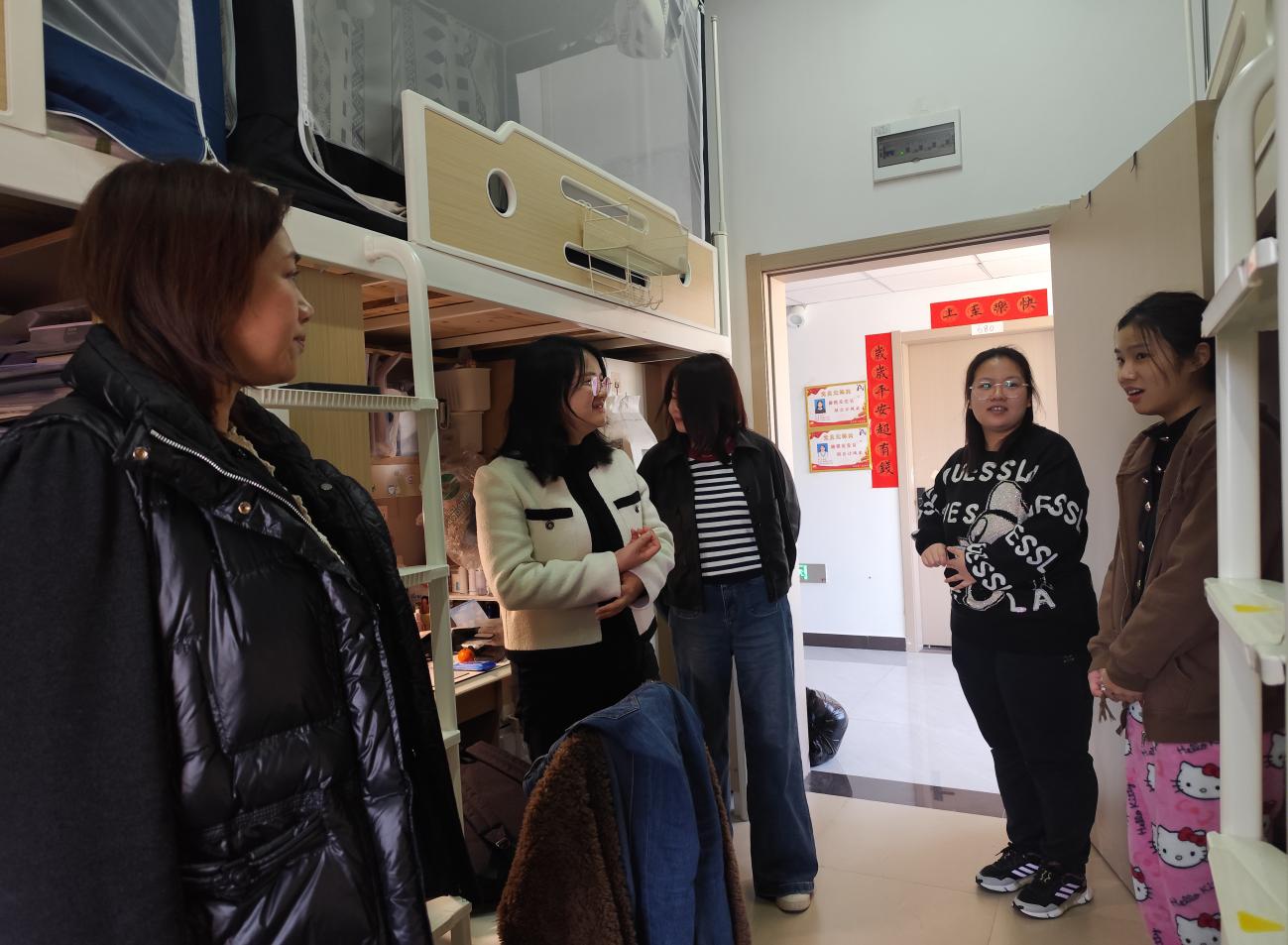 此外,院领导一行还深入到学生宿舍,详细询问了学生的生活习惯、宿舍成员之间的相处情况,以及生活方面是否存在困难等,充分了解他们对新学期的期待、对课程的满意度以及对未来的职业规划,向学生提出了指导性建议。在查寝过程中,院领导、辅导员们还重点检查了宿舍用电安全、卫生安全等问题,高度关注了学生的思想动态和心理健康情况并及时给予心理疏导。