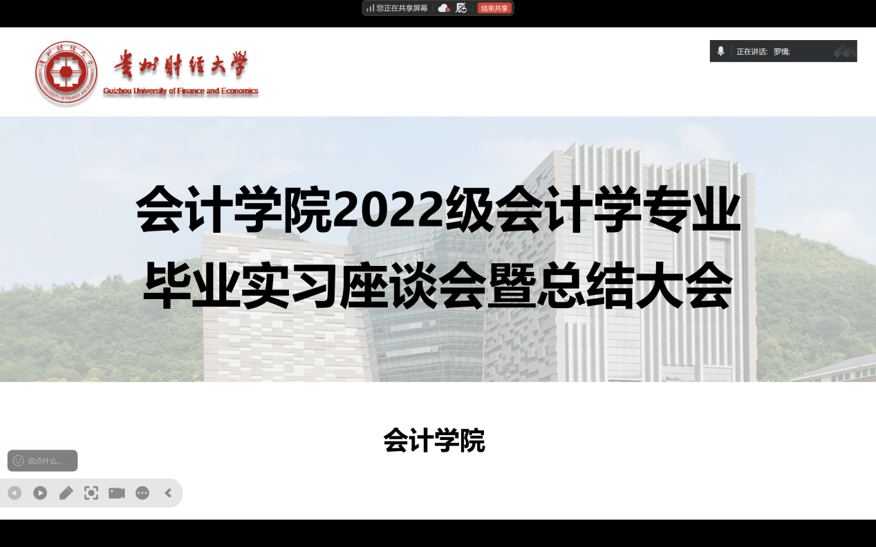 会计系通过腾讯会议平台召开2022级本科生毕业实习总结座谈会暨总结大会。会计系副主任罗毅、徐筱彧,指导老师窦家春、赖洁基、向利、王建忠,以及2022级会计学专业(含智能会计实验班)部分学生代表参加会议。会议由徐筱彧主持。