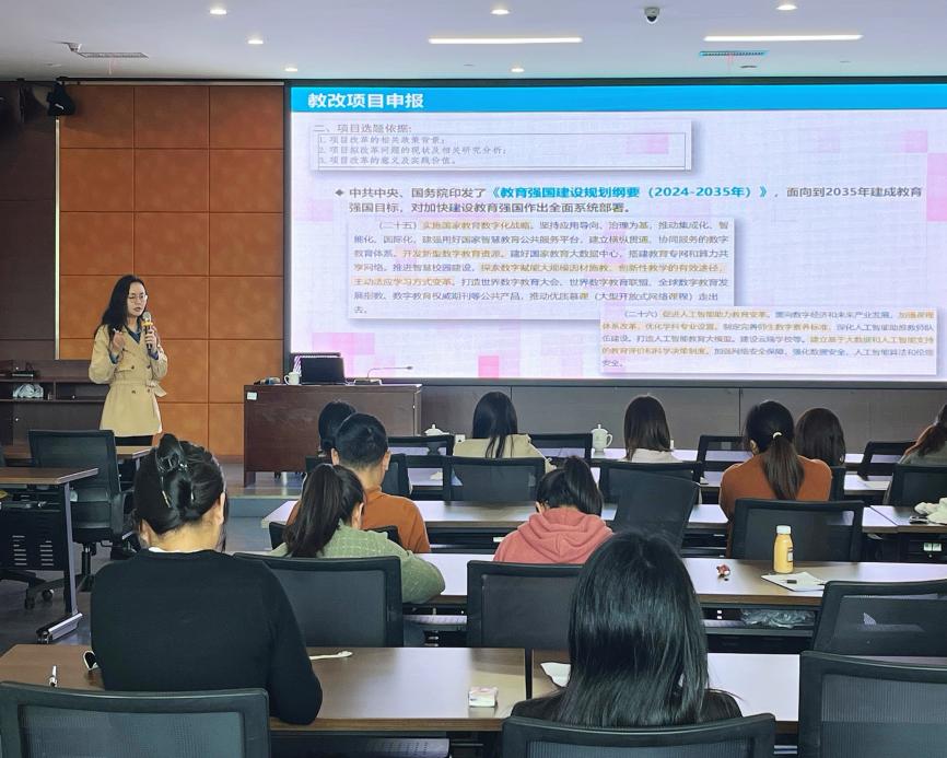 讲座上,耀友福以“学术研究中的探索与创新”为题,结合自身科研经历,从研究感思、研究选题、项目撰写与申报、论文创作与发表四个角度出发,与在场老师们分享了当下一些热门选题,以及省级、国家课题的撰写要点,论文审稿意见回复、投稿发表等实操经验。陈羽桃以“教研互促,笃行拓新——教研融合背景下的教改与科研能力提升”为题,围绕教改项目申报、实证研究的基本要点和论文范式、学术论文选题与写作三大核心内容展开系统分享。她结合《教育强国建设规划纲要》与数智化发展趋势,解读教改申报政策导向与选题逻辑,强调立足教学“痛点、堵点、难点”提炼真问题。
