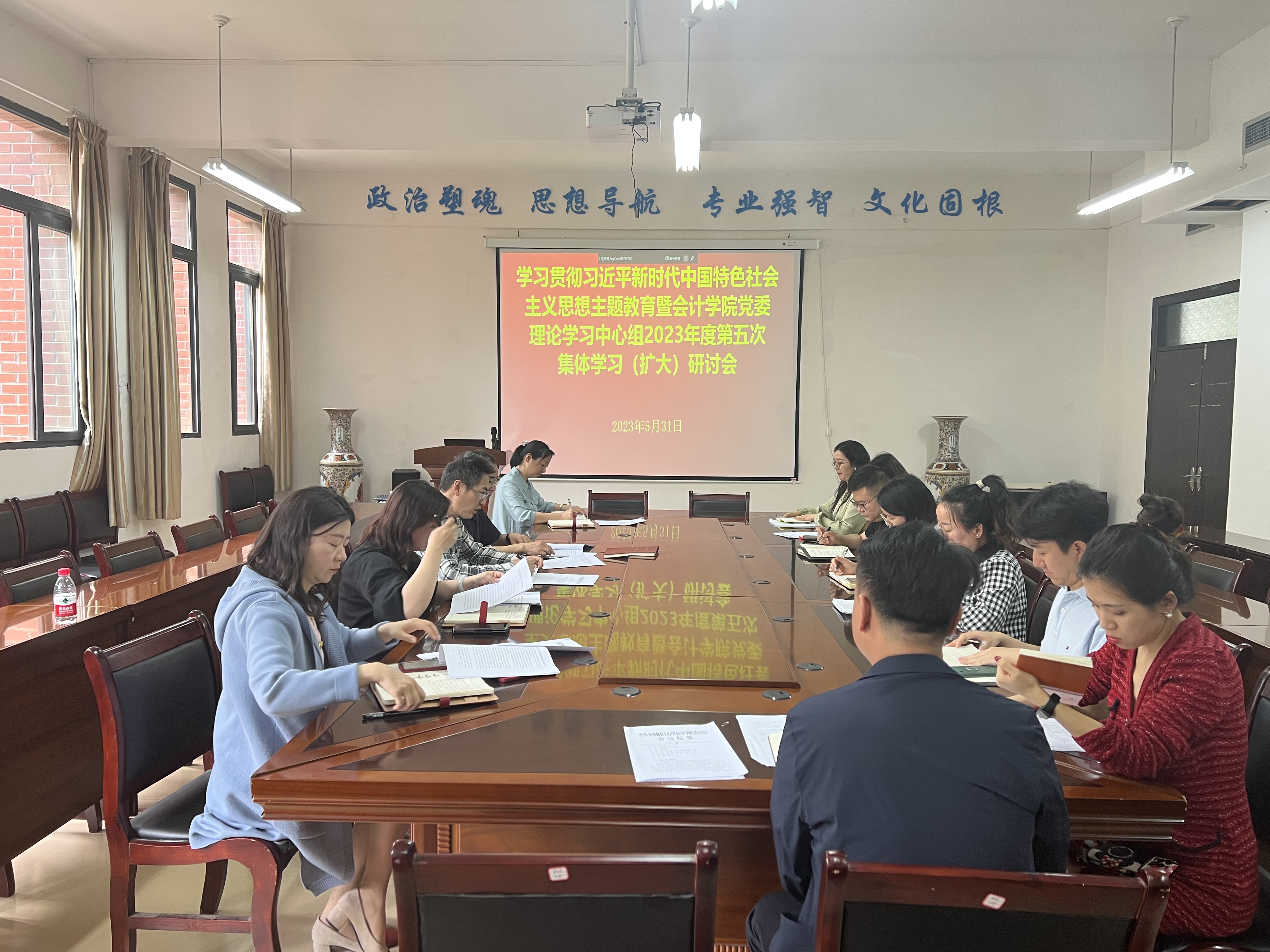 党委在崇德楼206会议室召开学习贯彻习近平新时代中国特色社会主义思想主题教育暨党委理论学习中心组2023年度第五次集体学习(扩大)研讨会。学院党委班子成员、副科级以上干部及党支部书记参加会议,学院党委书记聂永刚主持会议。