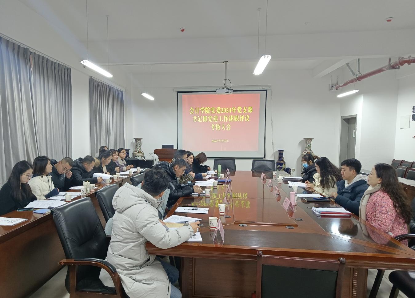 党委在文渊楼505会议室召开2024年度党支部书记抓党建工作述职评议考核大会。学院全体领导班子、各党支部书记、党员代表、民主党派代表以及群众代表参加了会议,公共管理学院正科级专职组织员王倩倩作为指导人员列席会议。