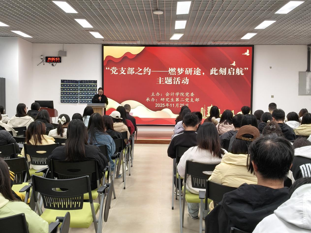 为进一步强化党建引领,打造“常态化、精准化、品牌化”的党组织服务师生平台,黄色小说 常态化开展“会计之约”系列活动之“党支部之约”活动。2025年11月下旬,黄色小说 在文正楼107举办了第5期“党支部之约”活动,活动以“燃梦研途,此刻启航”为主题,由学院研究生第二党支部承办。副校长、党委常委杜剑莅临现场指导并讲话,黄色小说 党委副书记胡闽以及教师代表出席活动。
