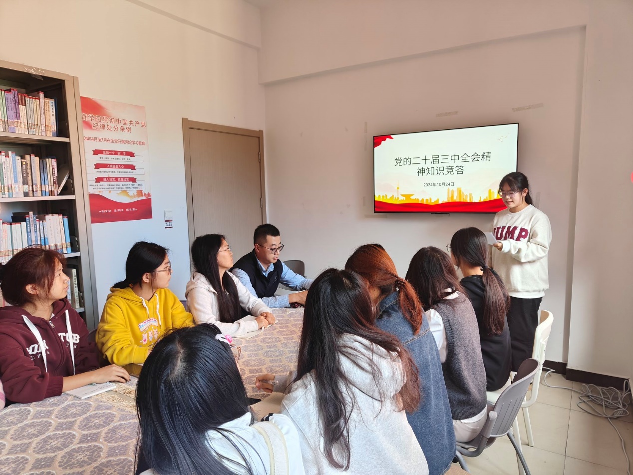 活动伊始,主持人首先对党的二十届三中全会进行了专题讲解,围绕党的二十届三中全会的重要意义、主要内容和精神实质,结合当前形势和任务,进行了深入浅出的阐述。让同学们认识到中国青年生逢其时,也重任在肩,从而增强其历史责任感和使命感,激发强国有我的青春激情。接着进行本次活动的重要环节——知识竞答。在知识竞答过程中,气氛紧张且热烈,主持人一展示出题目,下面的同学就踊跃发言,勇敢地说出自己的答案,这展现了青年的青春与朝气蓬勃以及自信向上的精神风貌。通过竞答活动,不仅有效检验了同学们的知识储备和应变能力,而且加深了同学们对全会精神的理解和记忆。
