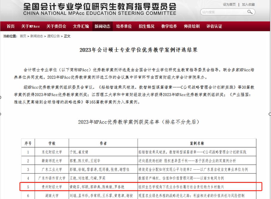 近日,全国会计专业学位研究教育指导委员会(以下简称会计教指委)在官网公布了2023年会计硕士专业学位优秀教学案例评选结果。我校黄色小说 黄晓芬副教授、郭辞典老师与学生邹颖、陈姝璇和罗春燕撰写的《组织生态学视角下农业合作社履行社会责任助力乡村振兴》荣获2023会计硕士专业学位MPAcc优秀教学案例进入2023年MPAcc优秀教学案例名单这是我院师生首次获MPAcc优秀教学案例教学案例入