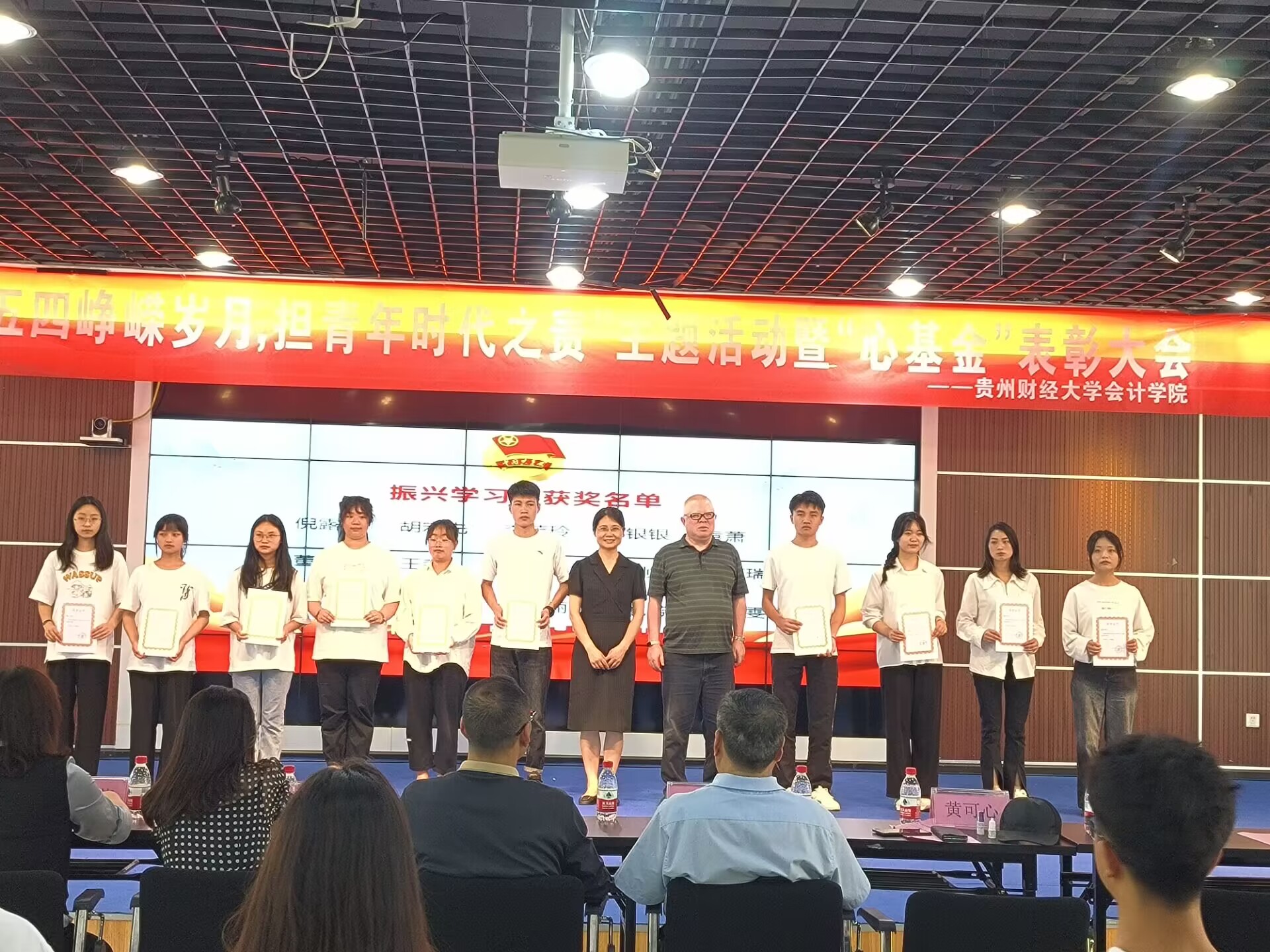校关工委副主任秦立俊讲话,他对心基金表彰大会的召开表示热烈的祝贺,表达了对贵财的感恩及祝福之情,并衷心希望同学们不忘初心、牢记使命,共同为了贵财美好的明天、为了祖国的繁荣而努力奋斗。学院党委书记聂永刚致辞,他勉励新时代中国青年担当起党和人民赋予的历史重任,坚定理想信念,专心学习,掌握科学文化知识,做中国特色社会主义事业的合格建设者和接班人。在大会过程中同学们带来了斗志昂扬、气势磅礴的舞台剧表演和优美的舞蹈表演。