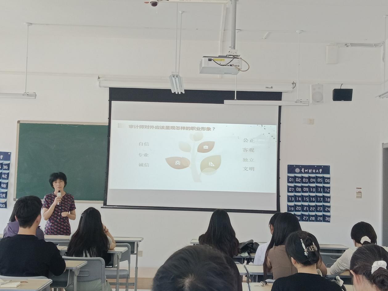 审计系系主任刘俊萍教授在文渊楼2-1为2025届审计学专业毕业生开展“审计师职场礼仪与沟通技巧”就业指导讲座。