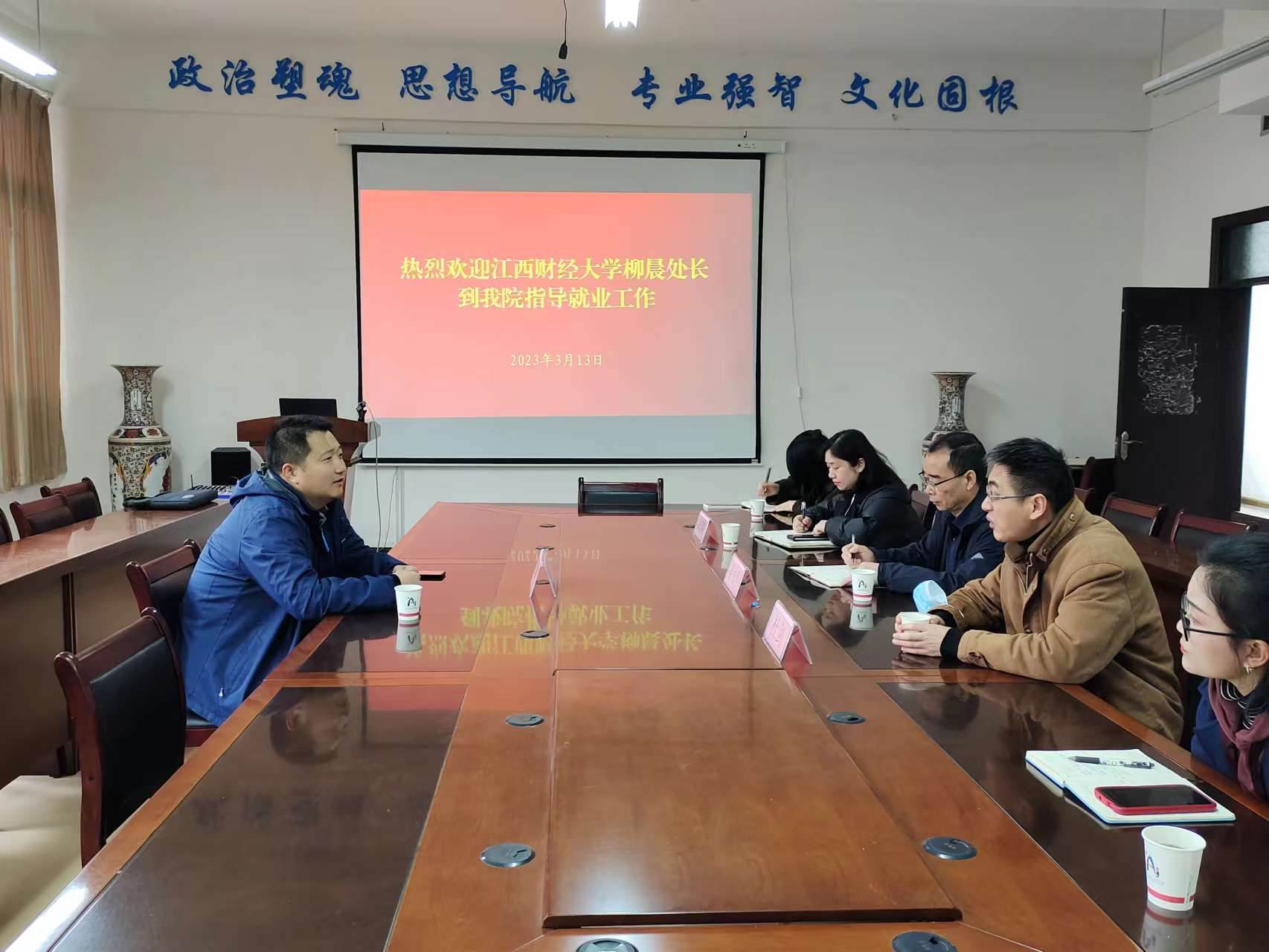 为进一步做好毕业生就业服务工作,提高我院2023届毕业生就业工作质量,2023年3月13日,江西财经大学招就处处长柳晨受邀到学院交流就业工作,学院党委书记聂永刚、院长杜剑、党委副书记黄忠莉以及毕业班辅导员蒲亚晴、张筱悦到场参加交流会议。