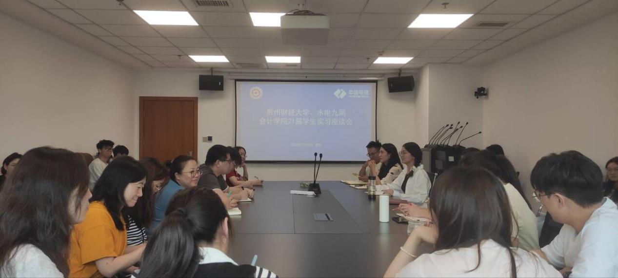 21届财务管理专业实习小组座谈会。此次座谈会由水电九局总会计师郑衡主持,参会人员包含22名实习生及22名实习单位委派的实务导师,共同探讨学生的实习经历与职业发展。