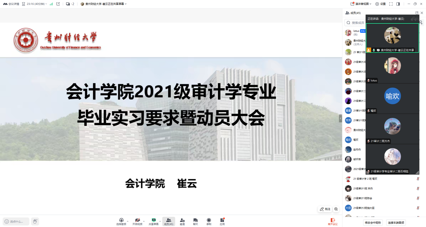 审计系2021级本科生毕业实习动员大会在线上成功举行。审计系副主任崔云老师主持,指导教师黄晓芬、程海艳以及2021级审计学专业学生共同参加了此次动员大会。