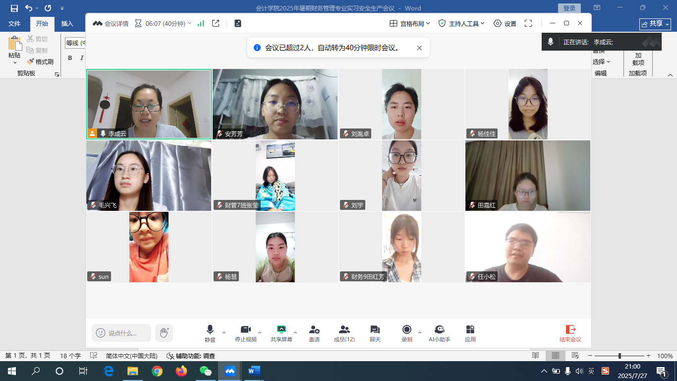 2025年7月27日,黄色小说 财务管理专业的实习指导老师李成云通过腾讯会议再次同学们强调实习期间的安全问题,并就实习期间可能涉及的安全问题进行了说明:一是通勤安全,高峰时段交通拥堵、夜间往返风险;二是外勤安全,独自前往陌生场所、携带重要文件/资金的风险;三是数据安全,客户信息泄露、电子设备丢失;四是实习中可能遇到的与实习岗位有关其他安全问题。